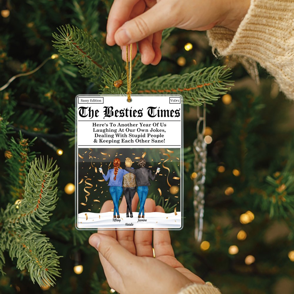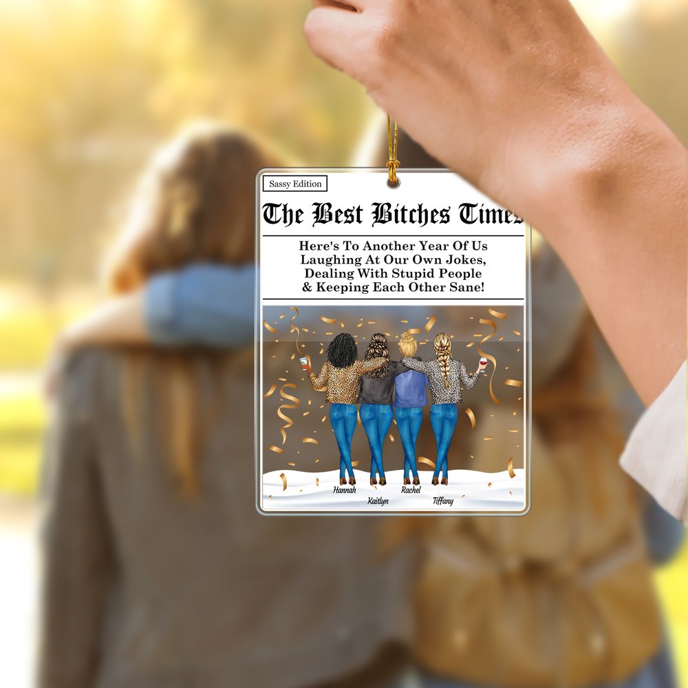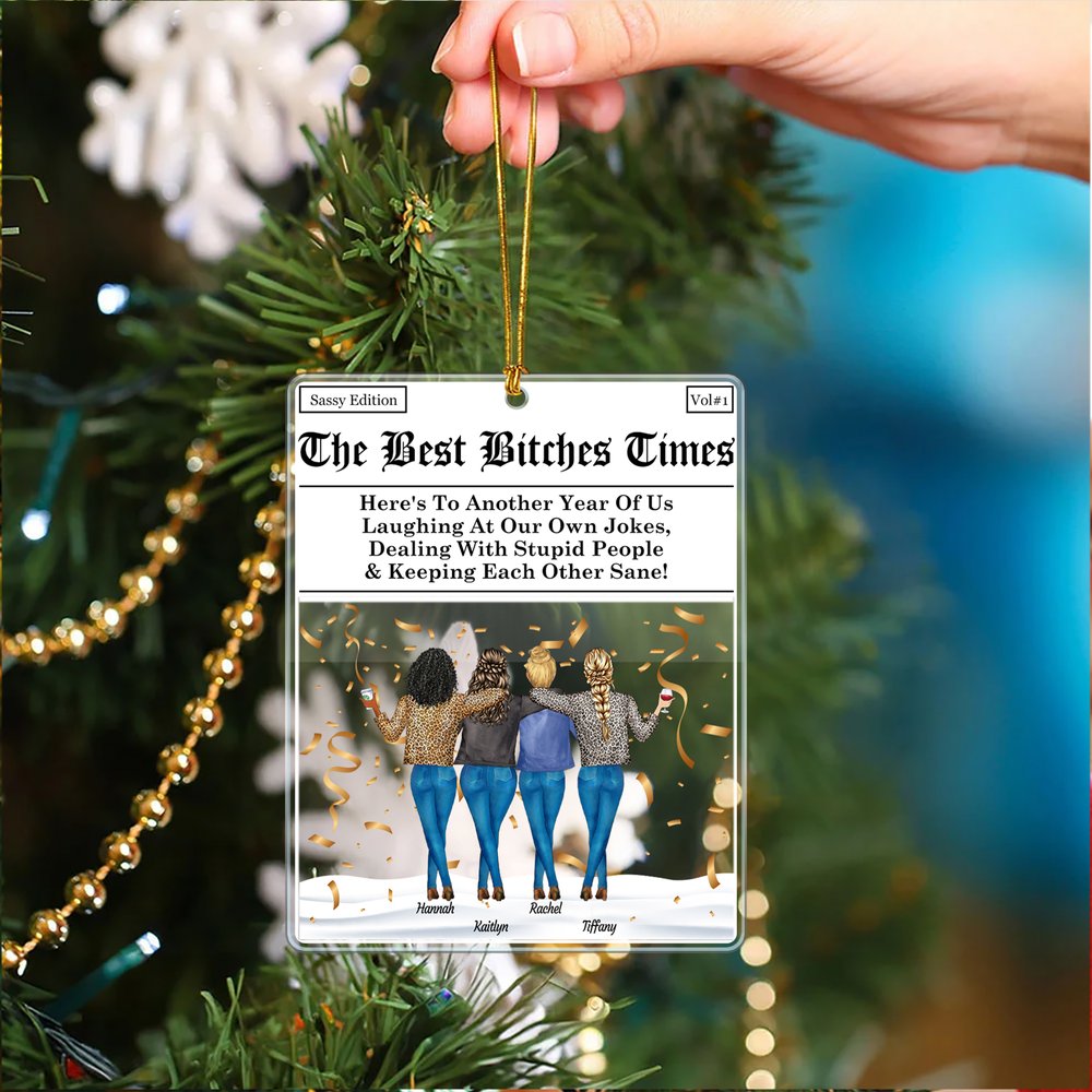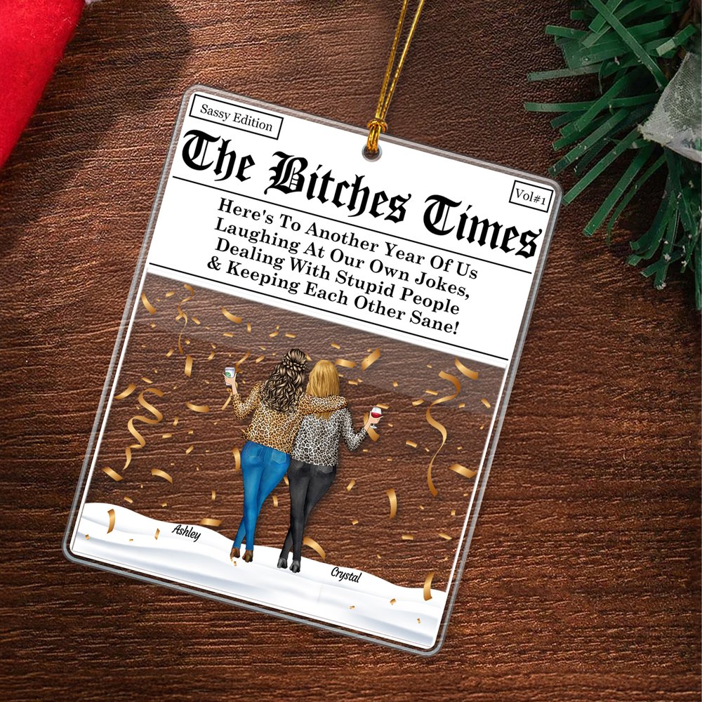 Prydnaden "The Bitches Times" har en lekfull tidningsdesign och låter dig anpassa tecknade bilder av 2-4 kvinnliga vänner. Du kan välja kroppstyper, frisyrer, hudtoner, drycker och lägga till varje persons namn, vilket gör det till en verkligt unik hyllning till ditt band.