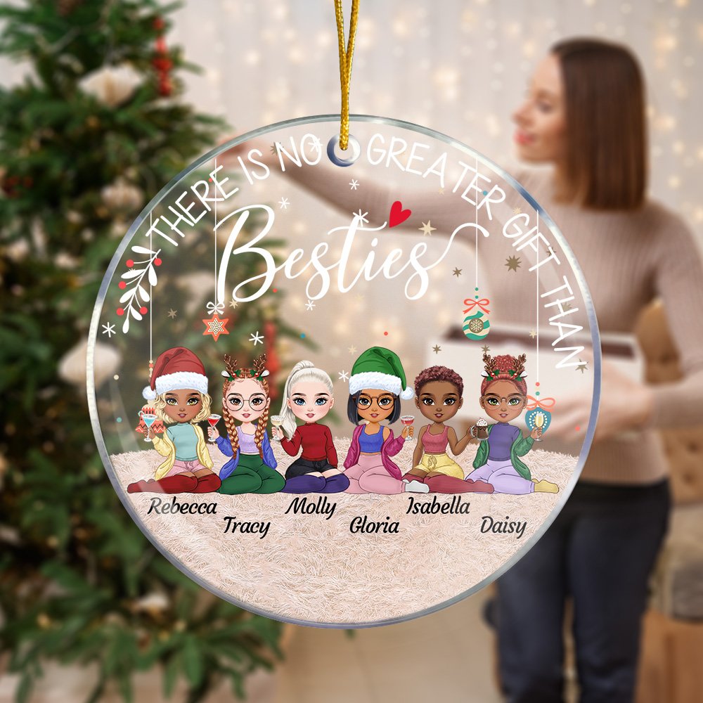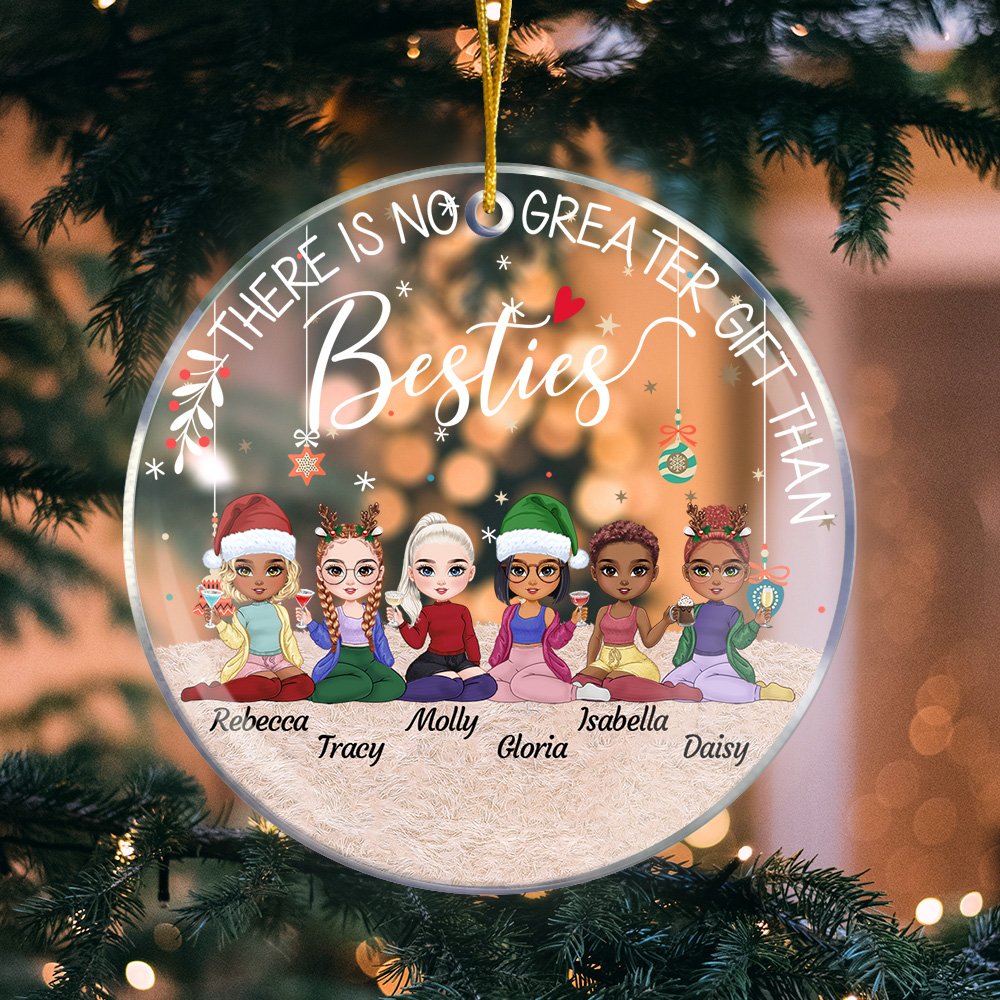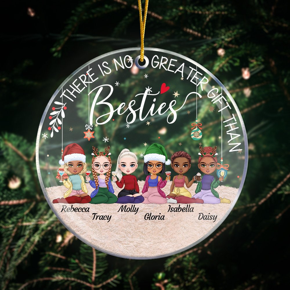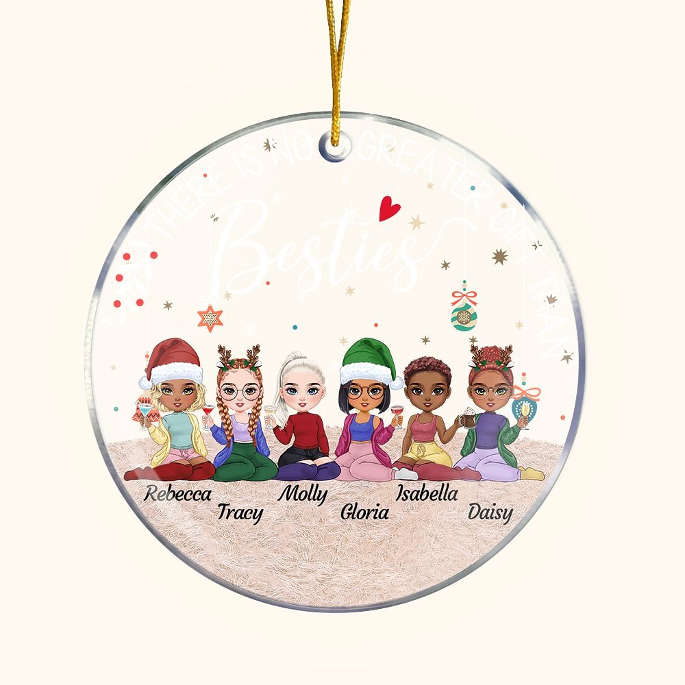 Denna hängande prydnad i akryl har en unik design med en charmig scen kombinerad med ett julelement som visar en hjärtevärmande bild av vänner som tillbringar tid tillsammans. Med tillägget "There Is No Greater Gift Than Besties" och ett personligt meddelande blir det en speciell minnessak som firar den eviga kärleken mellan människor.