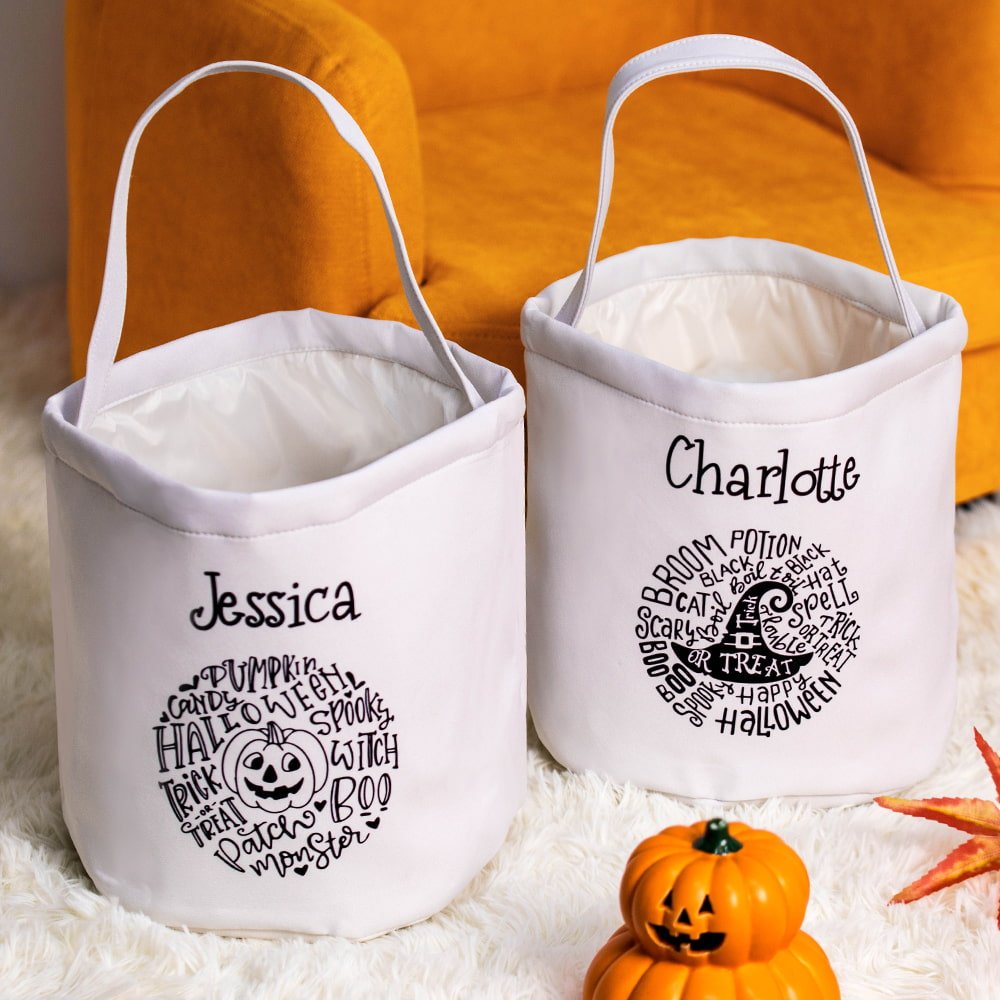 Halloween-korgen med handtag har en söt pumpa i mitten och ett namn tryckt på den övre delen. Ditt barn kan ta den här korgen som är anpassad med sitt namn för att ta utomhusaktiviteter eller sina godisar i den. Om han har många leksaker att lasta är den här korgen också ett bra val.