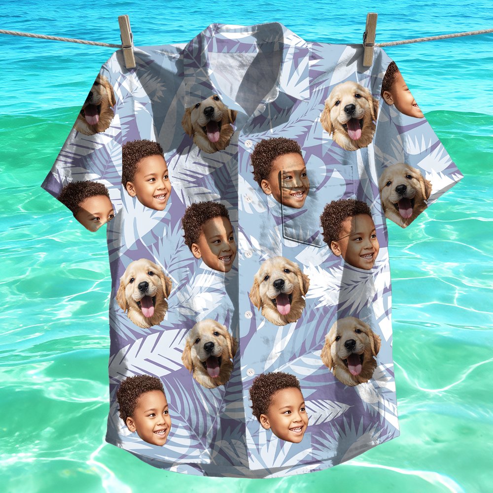 Ladda upp 1-2 foton av ditt barn eller husdjur, eller vem du än vill trycka, para ihop dem med bakgrunder med tropiska bladteman och få en unik sommartröja. Oavsett om det är för strandresor eller tropiska fester, gör den här skräddarsydda skjortan att du sticker ut med unika personliga element.