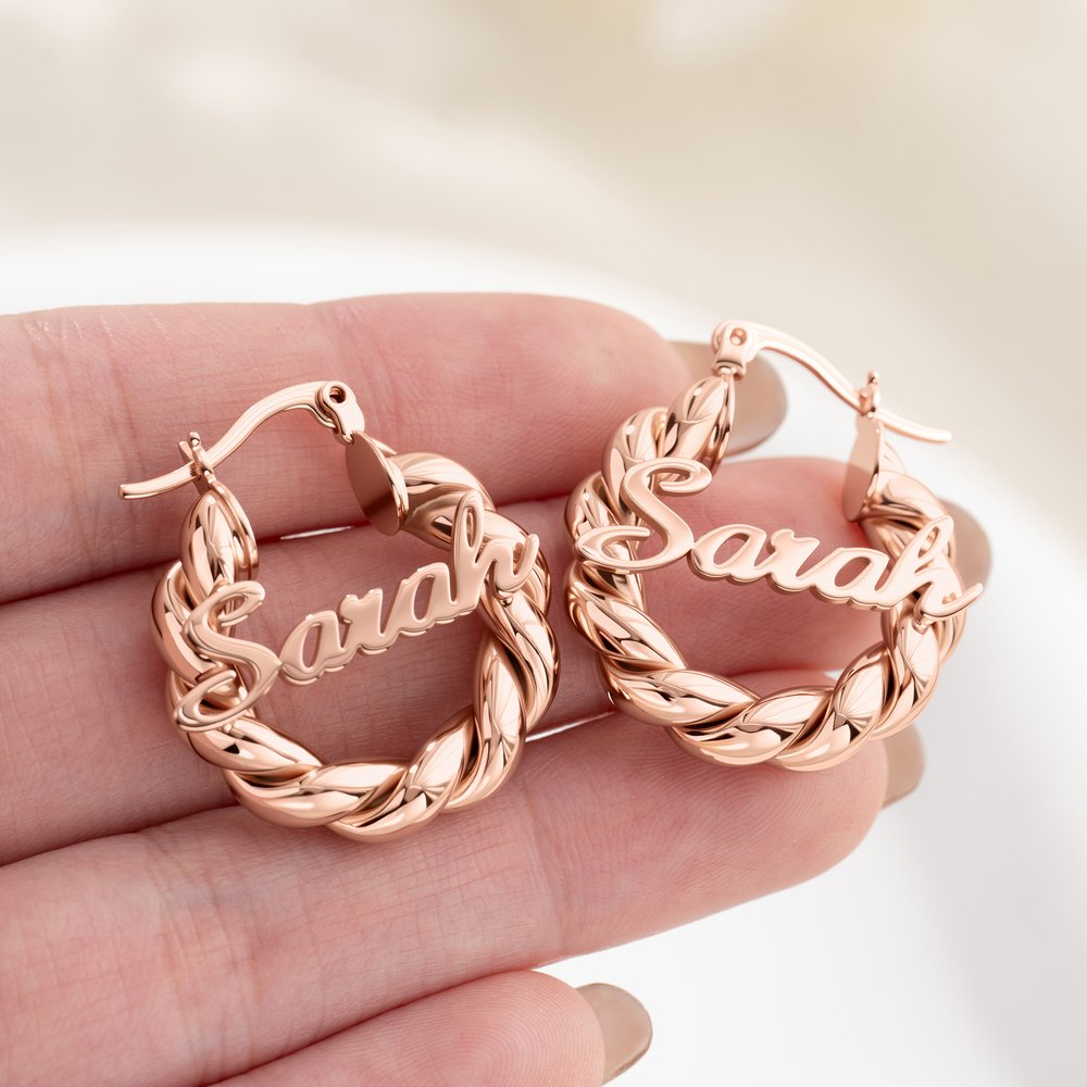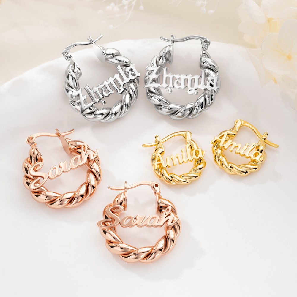 Dessa örhängen har en unik design med ett tvinnat band och ditt personliga namn, vilket ger en vintage men ändå modern känsla och en sofistikerad look. De finns i guld, platina och roséguld, tre färger som kompletterar olika stilar.