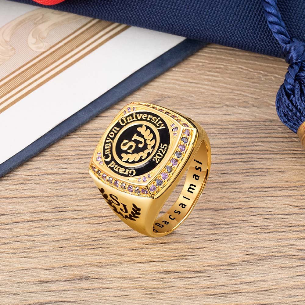 Denna personliga signetring är ett utmärkt val för akademiker som vill vårda sina minnen. Ringen kan anpassas med den examinerades initialer, skolans namn, examensår och text och är dekorerad med en cirkel av ädelstenar. Det är inte bara ett smycke utan också ett permanent märke av skollivet, så att avgångseleverna kan minnas de ungdomliga åren när de bär den.