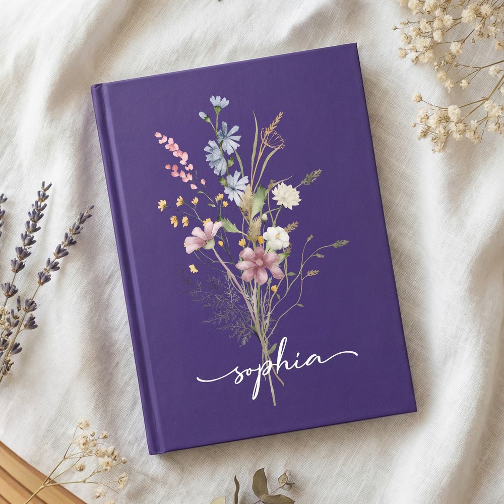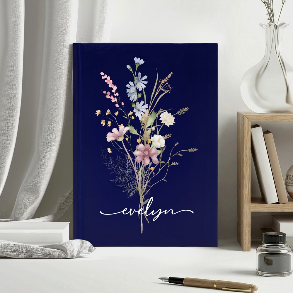 I centrum för vår anteckningsbok står en elegant bukett med vilda blommor från förr, återgiven i en handritad stil. Mjuka, skiktade färgtoner och fritt arrangerade blommor skapar en delikat, nostalgisk look - elegant men ändå varmt bekant. Namnet kan göras personligt på omslaget, vilket gör varje anteckningsbok till både ett praktiskt brevpapper och en unik minnessak.