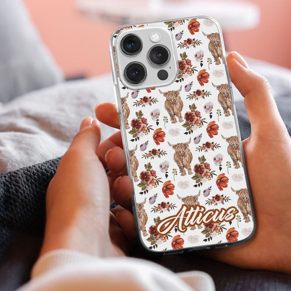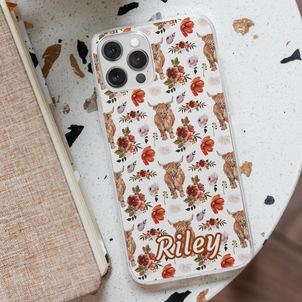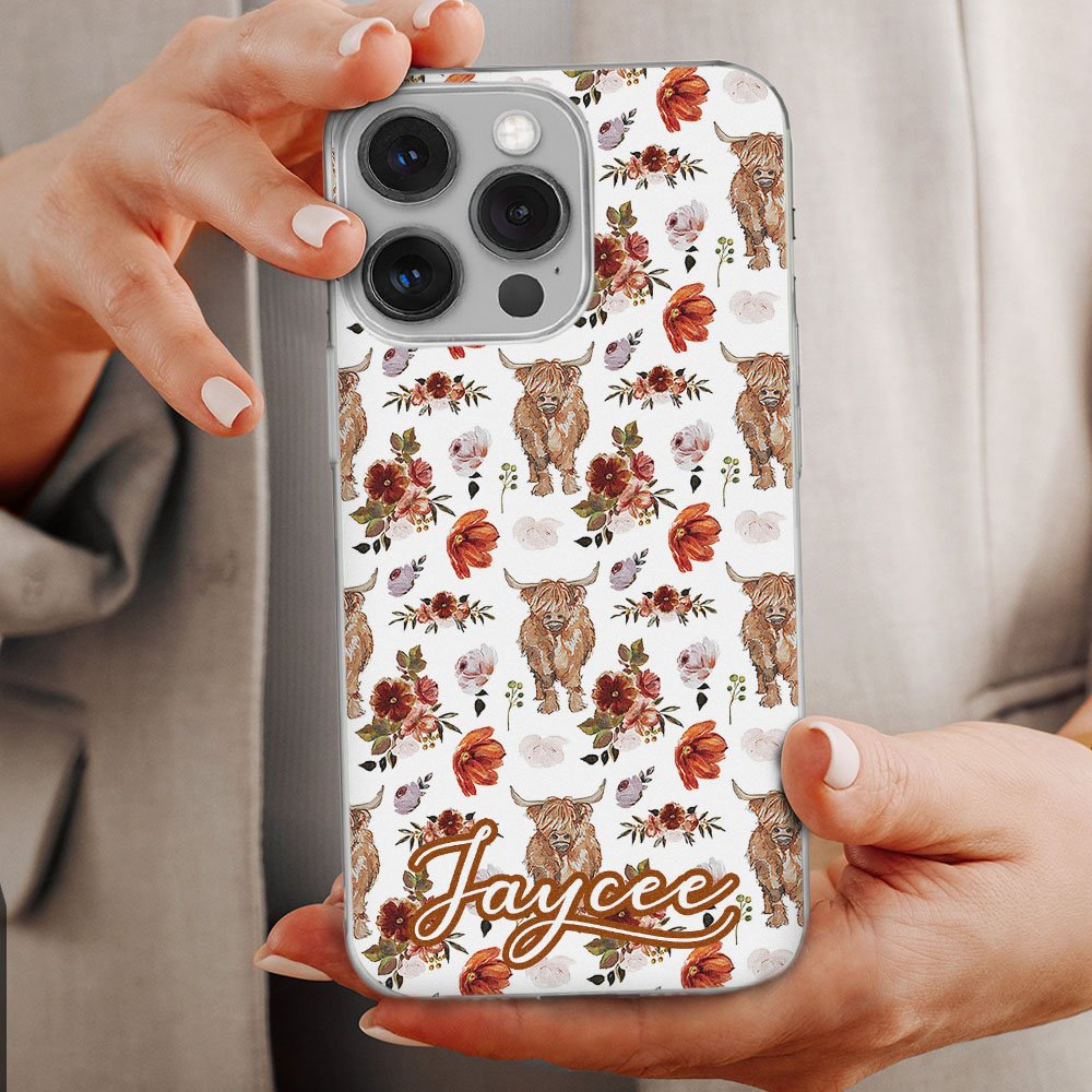 Detta highland cow flower-telefonfodral kan anpassas med ditt namn. Det finns 5 olika typsnitt att välja mellan. Denna unika gåva kommer säkert att uttrycka din hjärtliga omsorg och kärlek till en familjemedlem eller en vän.