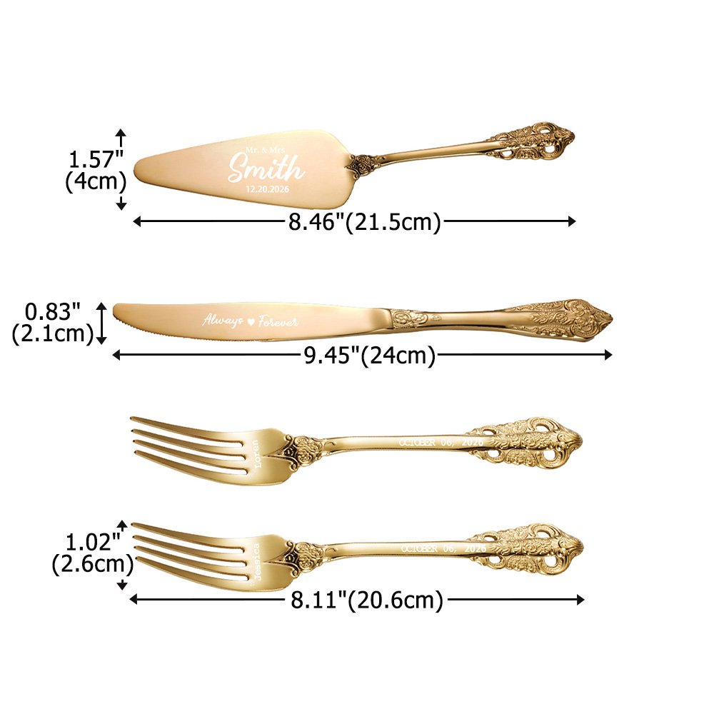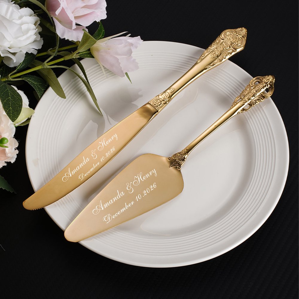 Vårt tårtskärningsset har en kunglig vintageinspirerad design, prydd med intrikata texturerade mönster som utstrålar elegans och sofistikering. Med åtta distinkta stilar att välja mellan kan varje del anpassas med parets namn och speciella datum, vilket förevigar deras sötaste stunder. Vi tillgodoser alla dina behov och finns som ett tvådelat set eller ett fyrdelat set.