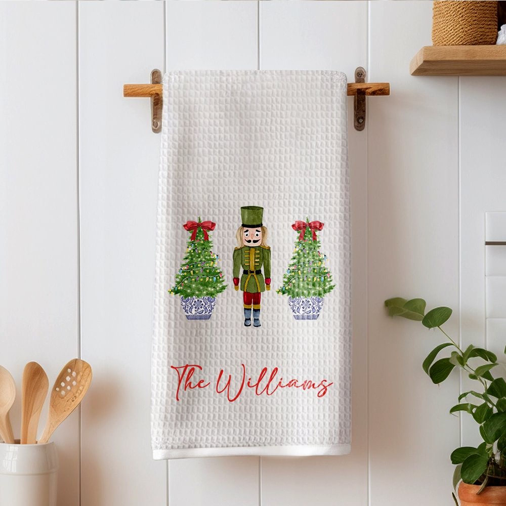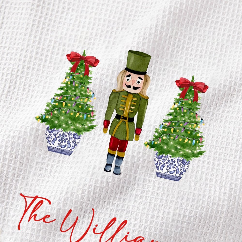 Den här kökshandduken visar en vackert illustrerad nötknäpparsoldat i akvarell tillsammans med två festliga julgranar prydda med ljusslingor, i en klassisk blåvit kinesisk porslinskruka. Designen blandar på ett harmoniskt sätt traditionella julelement med elegant orientalisk estetik. För att göra den extra speciell kan du göra den personlig med text, vilket ger en hjärtlig touch till din juldekor.
