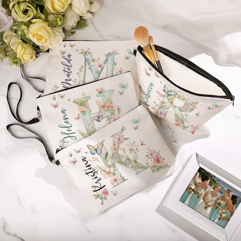 Den här kosmetikväskan är både vacker och unik! Med ett blommigt akvarellmönster och fjärilar känns den både lätt och livfull. Du kan enkelt sätta ditt namn eller dina initialer på den för att göra den helt personlig. En perfekt väska för dig som gillar både stil och funktion.