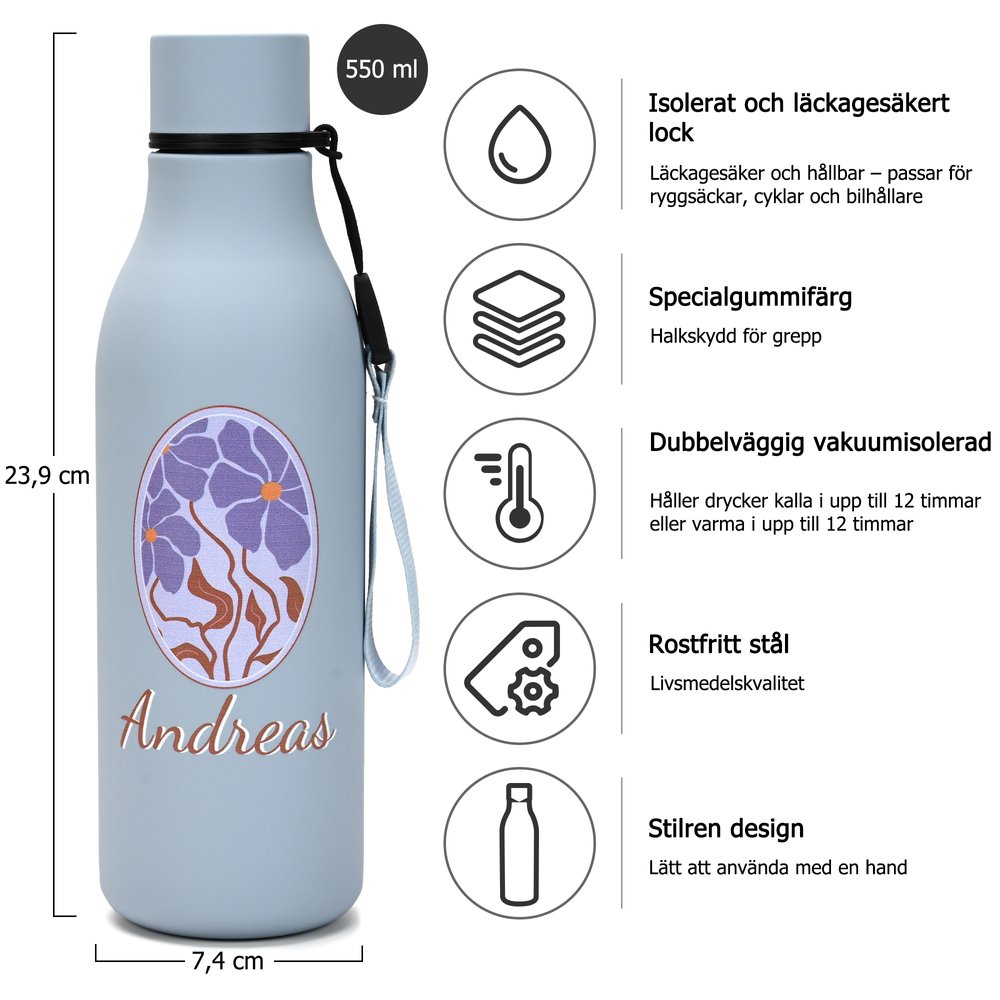 Våra vattenflaskor finns i 9 sobra färger och har en frostad textur som förkroppsligar elegans. Flaskan har en dansk blomsterdesign i akvarellstil med en oregelbunden vågformad ram, vilket är kreativt och konstnärligt. Du kan anpassa ditt namn för att skapa en unik accessoar som speglar din stil.