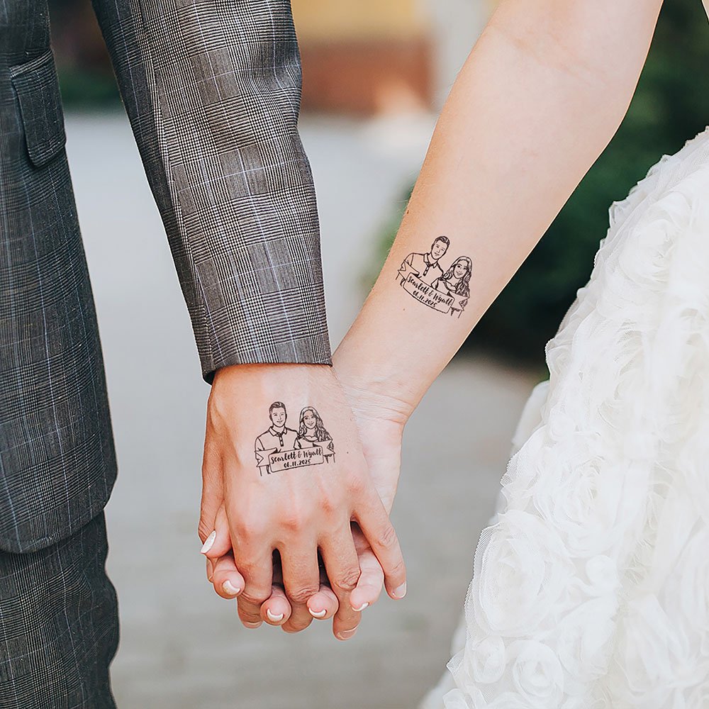 Fira kärleken på ett roligt och oförglömligt sätt med dessa personliga tillfälliga tatueringar med parets porträtt, namn och bröllopsdatum. Oavsett om du är brud, brudgum eller festfixare ger dessa tatueringar en personlig touch till firandet och får varje gäst att känna sig som en del av kärlekshistorien.