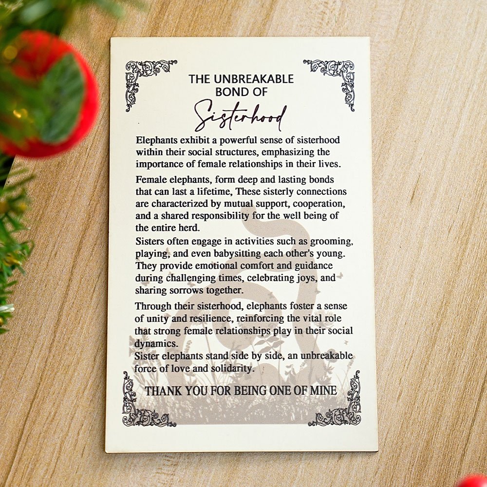 Prydnadens design är baserad på elefanten, som symboliserar styrka, visdom och enhet i kulturen. Orden "THANK YOU FOR BEING ONE OF MINE" på prydnaden uttrycker uppskattning och tacksamhet för systerskapet. Namnet kan anpassas längst ner för att göra det mer exklusivt.
