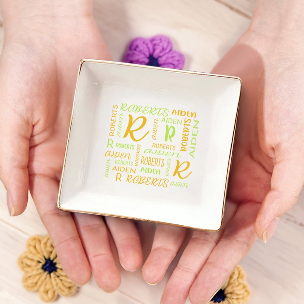 Denna smyckesplatta med ordmolnsdesign finns i två stilar och sexton färger i guld, brunt, marint eller rött, och du kan anpassa den med dina initialer och namn, vilket gör den till en unik gåva som uttrycker din omsorg och välsignelse.