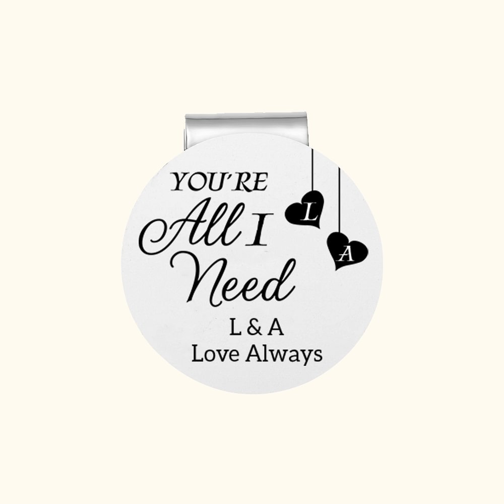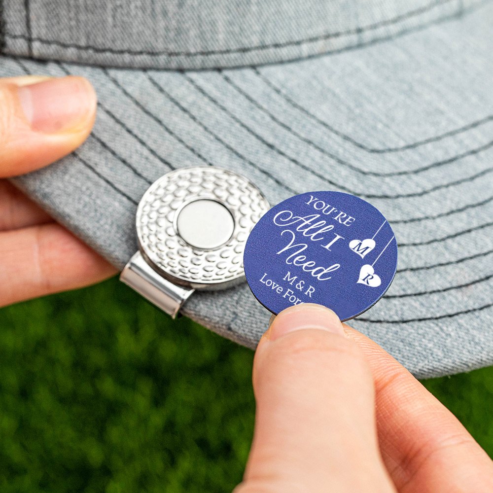 This hat clip is designed to embellish your ball cap and add a bright color to it. It is a true fusion of sports and fashion. The slogan "You're All I Need" on the hat clip adds a romantic connotation to it.