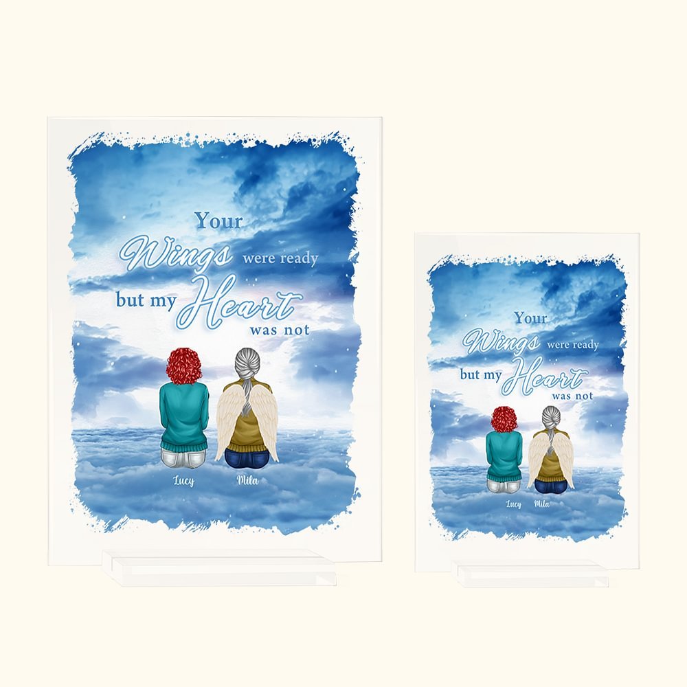 Uniquely designed, this acrylic plaque features a charming scene combined with a Christmas element that shows a heartwarming image of family or friends spending time together. With the addition of "Your Wings Were Ready But Our Hearts Were Not" and a personalized message, it will be a special keepsake that celebrates the everlasting love between people.